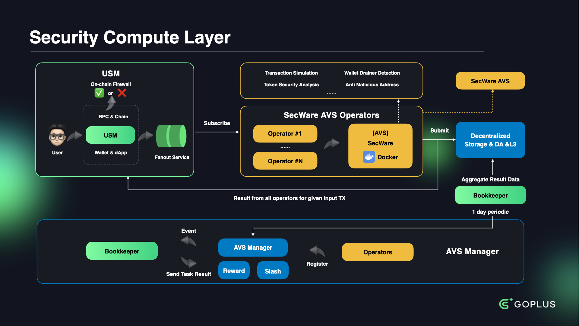 * **SecWare AVS**: Each type of security service is provided as a different Docker image, allowing for flexible and scalable deployment across the operator nodes. These Docker images must comply with the standards and specifications set forth by GoPlus for SecWare. Through the SecWare protocol, developers can upload and register these images, ensuring compliance and interoperability of all security services.